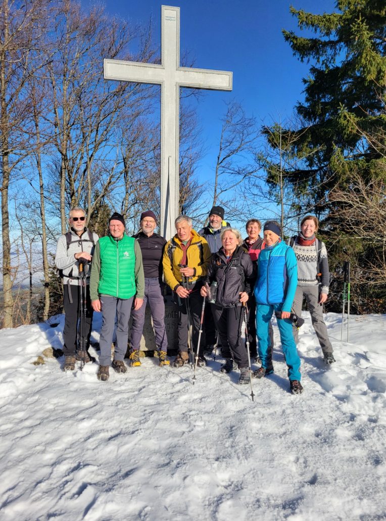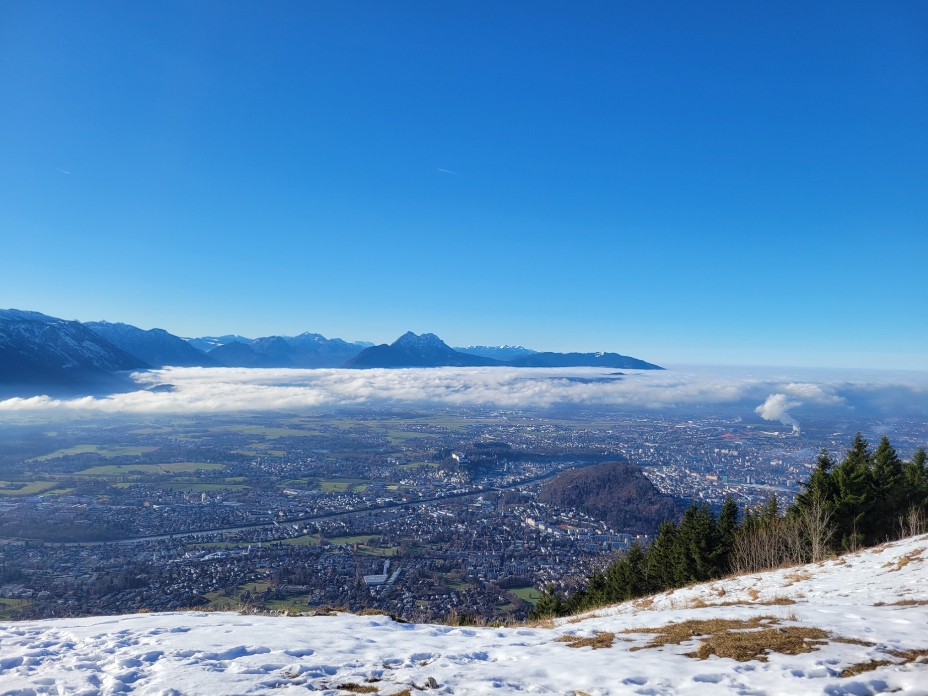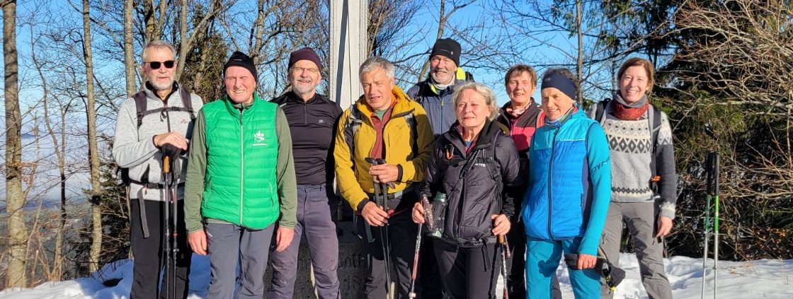 Zu einer Winterwanderung machte sich ein Gruppe Alpenwanderer im voll besetzten Sektionsbus auf nach Salzburg. Pünktlich zum Start vom Schmedererplatz lichtete sich der Nebel immer mehr und es dauerte nicht lange, bis man in der Sonne die wärmsten Kleidungsschichten im Rucksack verstauen konnte. Der Weg führte über die Gehrsbergalm und nach Überqueren der Gaisbergstrasse auf gutem Steig an einem Felsfenster vorbei, das natürlich fotografiert werden musste. Nachdem der Schnee auf dem teils doch steilen Weg immer mehr wurde, wurden zur Sicherheit die Grödel montiert und so ging es ohne Problem zum Gaisberggipfel. Hier erwartete uns ein wolkenloser Himmel und eine fantastische Fernsicht. Das Genießen des Ausblicks auf die Stadt Salzburg mit dem Watzmann als Hintergrund und des ganzen Panoramas mit Dachstein bis zur Hochalmspitze in der Ferne erforderte dann auch eine ausgedehnte Gipfelbrotzeit. Der Abstieg erfolgte dann auf schönem Weg gemütlich über die Zistelalm und die alte Trasse der ehemaligen Zahnradbahn zurück zum Ausgangspunkt. Nachdem der Nachmittag noch jung war, ging sich auch noch eine Kaffee-Einkehr in Bergheim aus für eine kleine Nachbesprechung.