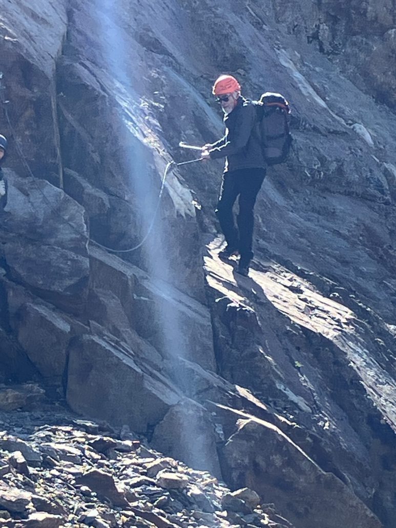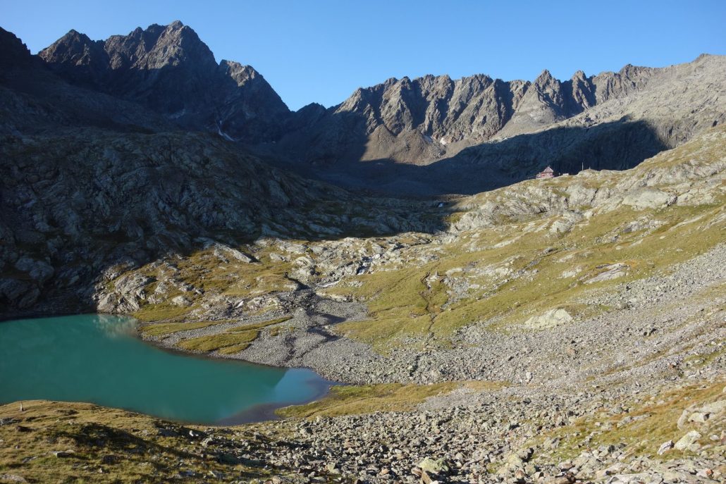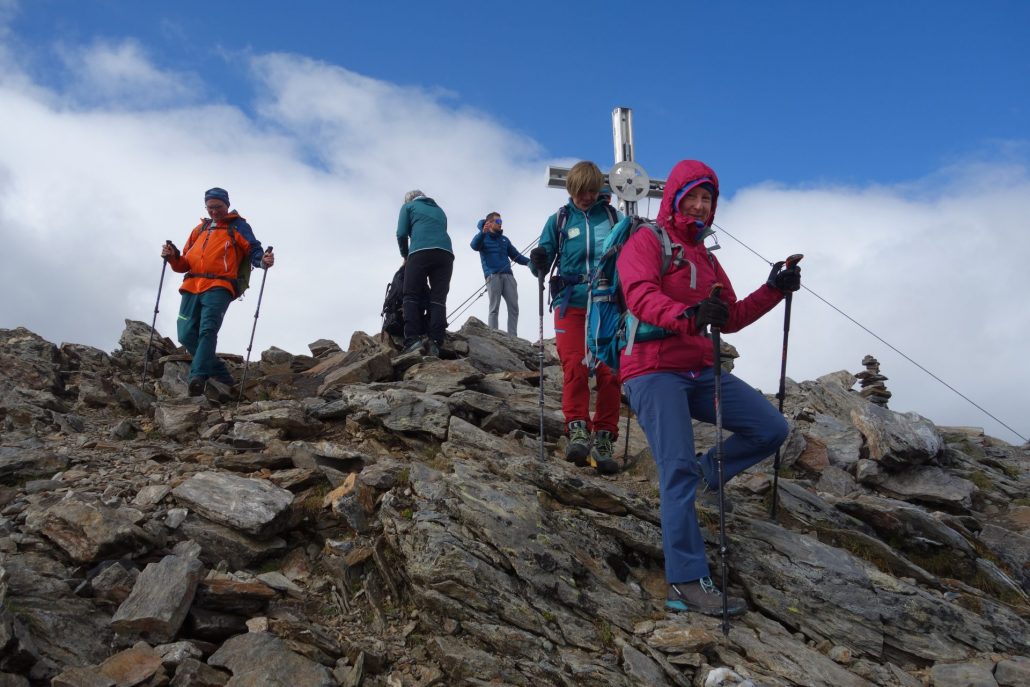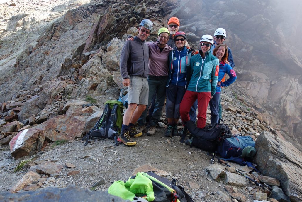Am 3. Tourentag starten wir zur Noßberger Hütte. Am Kreuzsee vorbei und über das Kreuzseeschartl erreichten wir, die Abhänge der Weißenwandspitze querend, über einen steilen Aufstieg die niedere Gradenscharte auf 2.796 m. Oben direkt an der Scharte erwartete uns der Gradensee und noch zwei weitere kleinere Seelein. Der Absteig zur Noßberger Hütte führte über steile Gletscherschliffplatten. Diese waren glücklicherweise trocken und boten guten Halt. Die Hütte liegt sehr schön am großen Gradensee und unsere kühnen Eisbaderinnen genossen das eisige Wasser. Wie die Tage zuvor starteten wir an Tag 4 unsere Wanderung um 8 Uhr. Zuerst leicht fallend führte der Steig am Mittersee vorbei. Bald wurde es zunehmend steiler und schweißtreibend zackelte der Weg hoch hinauf in die Hornscharte, der Schlüsselstelle der Tour. Für die letzten 100 Hm verließen wir den Schotter und stiegen auf einer steilen, seilversicherten Rampe bis zur Scharte. Oben hatten wir einen tollen Blick zum frisch verschneiten Glockner, unser nächstes Ziel das „Böse Weibl“ und die Eberfelder Hütte tief unten. Wieder seilversichert ging es steil über gestuftes Gelände abwärts, bis es unangenehm schottrig wurde und wir schließlich dann doch gemütlich die Eberfelder Hütte erreichten. Bald war ein Teil der Gruppe zu einem kleinen See etwa 200 Hm über der Hütte unterwegs. Jedoch war das Wasser eisig, zudem blies ein kalter Wind. Das war nichts für die empfindliche Sensibilität der beiden Begleiter. Nur die Frauenpower ließ sich nicht von einem Bad im See abschrecken.