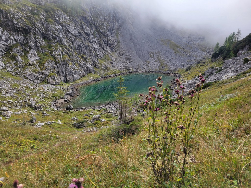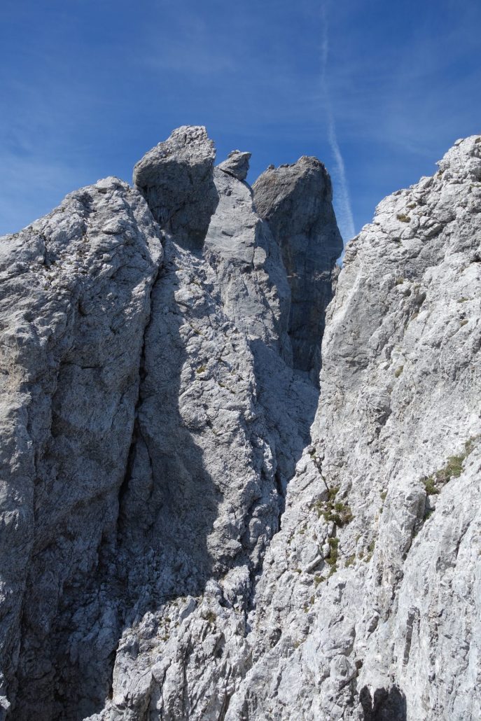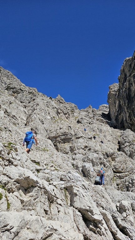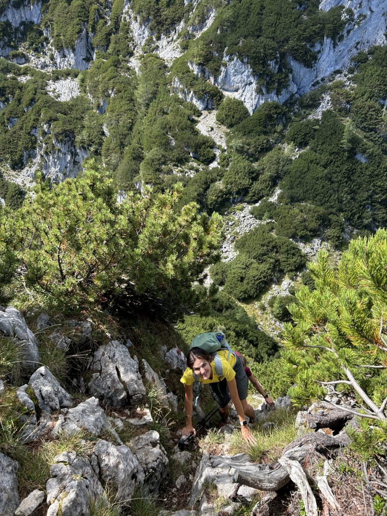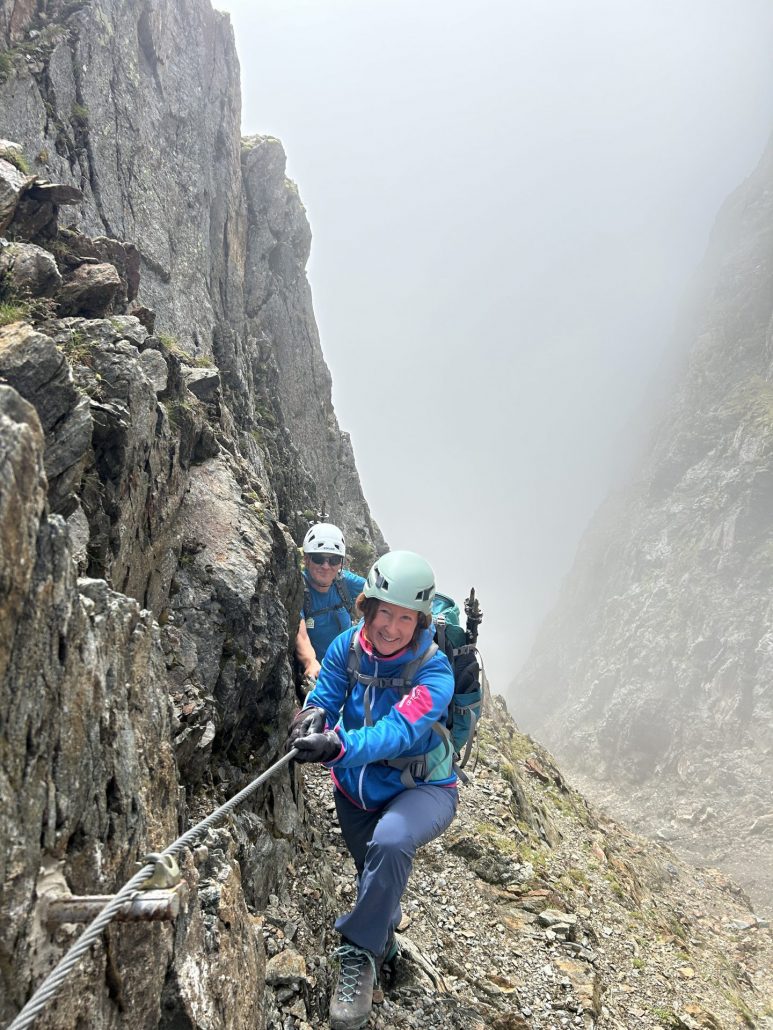 Am 3. Tourentag starten wir zur Noßberger Hütte. Am Kreuzsee vorbei und über das Kreuzseeschartl erreichten wir, die Abhänge der Weißenwandspitze querend, über einen steilen Aufstieg die niedere Gradenscharte auf 2.796 m. Oben direkt an der Scharte erwartete uns der Gradensee und noch zwei weitere kleinere Seelein. Der Absteig zur Noßberger Hütte führte über steile Gletscherschliffplatten. Diese waren glücklicherweise trocken und boten guten Halt. Die Hütte liegt sehr schön am großen Gradensee und unsere kühnen Eisbaderinnen genossen das eisige Wasser. Wie die Tage zuvor starteten wir an Tag 4 unsere Wanderung um 8 Uhr. Zuerst leicht fallend führte der Steig am Mittersee vorbei. Bald wurde es zunehmend steiler und schweißtreibend zackelte der Weg hoch hinauf in die Hornscharte, der Schlüsselstelle der Tour. Für die letzten 100 Hm verließen wir den Schotter und stiegen auf einer steilen, seilversicherten Rampe bis zur Scharte. Oben hatten wir einen tollen Blick zum frisch verschneiten Glockner, unser nächstes Ziel das „Böse Weibl“ und die Eberfelder Hütte tief unten. Wieder seilversichert ging es steil über gestuftes Gelände abwärts, bis es unangenehm schottrig wurde und wir schließlich dann doch gemütlich die Eberfelder Hütte erreichten. Bald war ein Teil der Gruppe zu einem kleinen See etwa 200 Hm über der Hütte unterwegs. Jedoch war das Wasser eisig, zudem blies ein kalter Wind. Das war nichts für die empfindliche Sensibilität der beiden Begleiter. Nur die Frauenpower ließ sich nicht von einem Bad im See abschrecken.