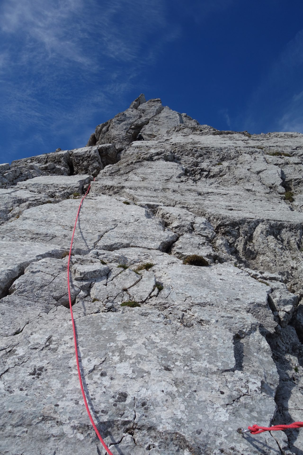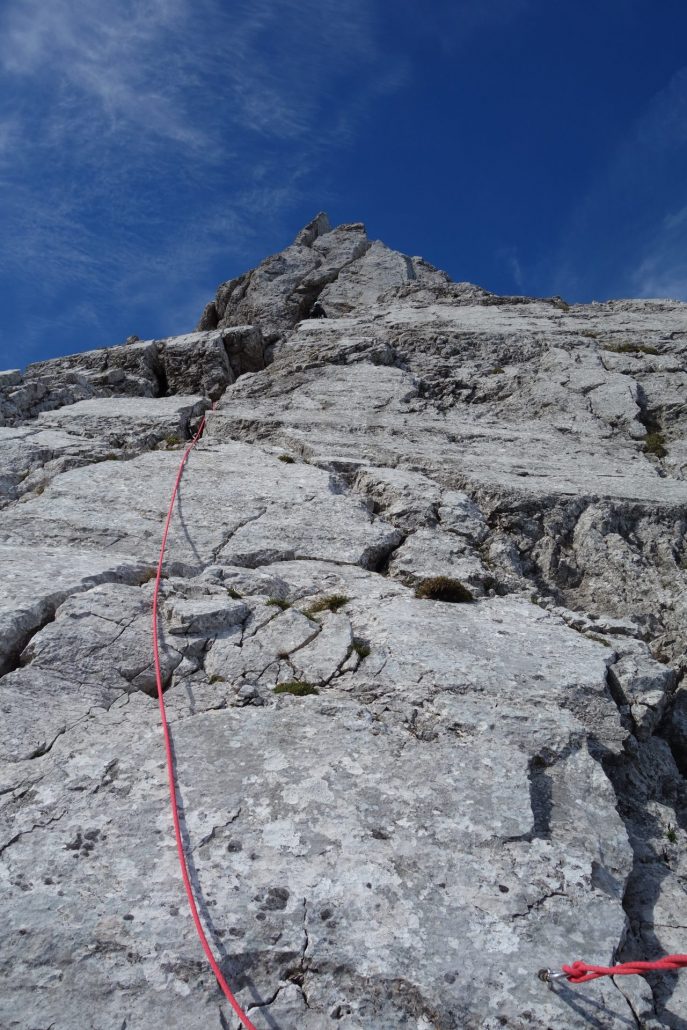 Am nächsten Morgen war Rudi den gegenüberliegenden Hang unterhalb des „roten Knopfes“ schon weit hochgestiegen und bereits in der Sonne, als wir wieder um 8 Uhr los starten. Unterwegs überholten wir eine Dreiergruppe, die sich mit viel zu schweren Rucksäcken hochquälte. Am Kesselkeessattel wurden wir bereits von Rudi erwartet und nach einer Rast am Gernot Röhr Biwak stiegen wir gemeinsam den Blockgrat zum „Bösen Weibl“ hoch. Der Name kommt angeblich von gefürchteten Wetterstürzen an diesem Bergkegel. Wir haben bestes Wetter und genießen oben den tollen Rundumblick – Hochgall, Großvenediger, Glockner, Rauriser Sonnblick… Über Blockgelände führte der Weg abwärts und über den Eselspfad wandern wir zur Glorer Hütte am Berger Törl 2.651 m.