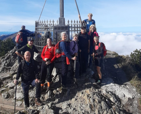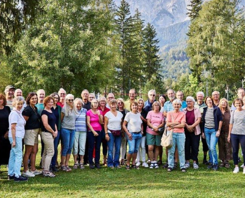 Mit dem Reisebus und Helmut als Fahrer fuhren wir vom Bahnhof Burghausen am Sonntagmorgen nach Gozd Martuljek. Dort hatten wir ein 4-Sterne Hotel und Sonne pur gebucht. Die geplanten Touren von Harald wurden mit Hilfe von Jutta, Sabine, Arthur und Hans als Wanderleiter durchgeführt. Unsere Wanderungen waren schweißtreibend, steil, steinig, anspruchsvoll und schön.Wir waren beim unteren und oberen Martuljek-Wasserfall und dem Pericnik-Wasserfall im Vratatal. Wir fuhren nach Italien in das Weißenfelser Tal mit den Zielen der Mangartscharte und der Ponza Piccola. Vom Lago de Fusine wanderten wir zur Luigi Zacchi-Hütte. Vom Wurzenpass ging es über viele Serpentinen zum Dreiländereck und dem Gipfel Pec. Bei der Fahrt nach Bled eroberte die Mehrzahl unserer Bergfreunde zuerst die Pokljuka-Schlucht und alle waren zur Stadtbesichtigung und Seeumrundung unterwegs. Eine Gruppe fuhr mit dem einzigen Sessellift bei Kranjska Gora hinauf, um den Gipfel des Vitranc zu erreichen. Der Techantinger Mittagskogel in den Karawanken, die Slemenova Spitze am Virsic-Pass und ein gigantischen Felsenfenster des Prisank wurden erstiegen.Wir nutzten Öffis und Bergbusse und manchmal durfte Helmut helfend einspringen. So auch bei einem kleinen Malheur, das einige unserer Wanderer erlebten, als sie auf die andere Seite des Gebirges in das Soccatal fuhren.Ausgelassene Stimmung unter den Wanderern und gemütliche Abende rundeten die schönen Bergtage ab. Mit einem Dankeschön ans Hotelteam, begleitet von einem flotten Lied, verabschiedeten wir uns von Slowenien.