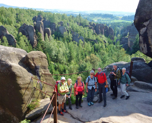 Wir starteten am Sonntag früh und fuhren auf ruhigen Straßen und Autobahnen quer durch Tschechien, an Prag vorbei, bis an die polnische Grenze bei Nachod. An einem Wanderparkplatz begann eine kleine Wanderung zu Aussichten auf die Felstürme der Braunauer Wände und mit Einkehr in der legendären Stern-Baude. Nach kurzer Fahrt erreichten wir unsere Unterkunft für die ersten 3 Tage, eine familiär geführte, ruhige Pension im wirklich letzten Dorf Böhmens.