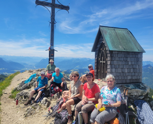 Bei herrlichem Wanderwetter begab sich die Alpenwanderergruppe im voll besetzten Sektionsbus Richtung Sachrang und dort hinauf bis zur Wandberghütte. Von da ging es über die Ackeralm hinüber zur Schreckalm und einen teils steilen Wiesenhang hinauf zur Mühlhornwand und den Kamm entlang über Wandspitz zum Gipfel des Geigelstein. Eine kleine Überraschung war es dann, da oben auf eine Gruppe Burghauser zu treffen. Es folgte eine ausführliche Gipfelpause und das Genießen einer fantastischen 360° Fernsicht, bevor man sich an den Abstieg Richtung Priener Hütte machte. Die eigentlich angedachte Einkehr dort musste allerdings entfallen, da die Hütte geschlossen war. Als mehr als adequaten Ersatz gab es dann auf der Ackeralm noch Kaffee und hervorragenden Kuchen, so dass wir uns frisch gestärkt nach einer doch langen und anspruchsvollen Tour wieder auf den Heimweg machen konnten.