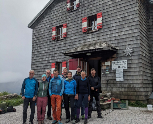Am Freitag 21.06. machten sich 9 Kletterbegeisterte auf den Weg zur Hofpürglhütte am Gossaukamm. Nach der abendlichen Spagetti-Stärkung ging es direkt mit vollem Magen und hochmotiviert in die ersten Kletterrouten am Reißzahn. 2 Nachzügler (spätere Anreise) erklommen in hungriger Erwartung die dampfigen 400 HM und freuten sich schon sehr auf die angepriesenen Spagetti. Diese stellten sich als Linseneintopf mit Semmelknödel heraus (absolut empfehlenswerte Alternative). Nach dem Essen lernten sich alle Tourenteilnehmer persönlich kennen und ließen den Abend im Hüttenraum gemütlich ausklingen. Am Samstagmorgen – nach nächtlichem Gewitter und Hagel – waren alle noch etwas verunsichert, welche Wetter-APP denn nun stimmen würde und ob der Tag am Fels trocken verlaufen würde. Schon sehr bald verzogen sich die Wolken und unter angenehm warmen Bedingungen wurden die Routen im Vorstieg und Toprope beim Mosermanndl, Sektor Take it easy erkundet. Neues Klettervokabular wurde ausgetauscht, z.B. morchelig, Häuchchen, Angsthase (Anm. Erläuterungen auf Rückfrage). Nach einer Mittagspause auf der Hofpürglhütte wurde anschließend ein anderer Klettersektor gewählt und beklettert. Abends gab es hervorragende Kartoffelknödel mit Hackfleischfüllung. Danach wurde in geselliger Runde Werwolf (Rollenspiel) und Mäxchen (Lügen) gespielt. Dabei wurde das Bluffen jedes Einzelnen auf eine harte Probe gestellt. In diesem Zusammenhang wurde der Autor für diesen Bericht ermittelt. Nach einer weiteren erholsamen Nacht brachen alle mehr oder weniger optimistisch (realistisch) auf, um wider Erwarten bei quasi trockenen Bedingungen (87 % Luftfeuchtigkeit) weitere Kletterrouten am Mosermanndl auszutesten. Nach einer mittäglichen Stärkung stiegen alle wohlbehalten ab. Auf der Heimfahrt wurden schon fleißig Erinnerungsfotos ausgetauscht. Vielen herzlichen Dank an Lisa für die gelungene Klettertour. Kletterweisheit: Jeder sollte sich einen Angsthasen halten. Julia
