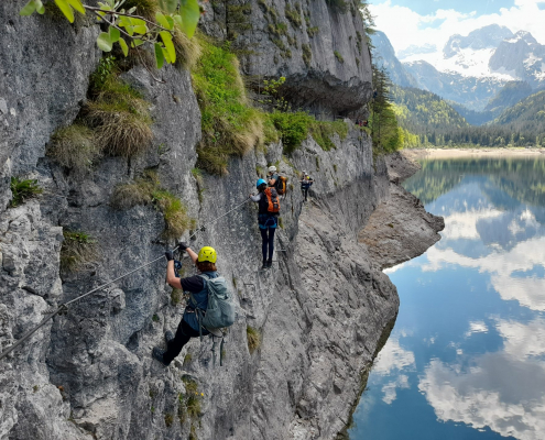 Gestartet sind wir um 08:00Uhr in Burghausen. Bei besten Wetterverhältnissen fuhren wir mit drei Autos nach Gosau zu unserer Unterkunft, welche Silke gebucht hatte. Das Haus Liesenfeld bot ideale Rahmenbedienungen bezugnehmend auf die Einrichtung und Lage. Der Klettersteigpark war zu Fuß erreichbar, ebenso das Gasthaus zum Abendessen und der tolle Bergblick von der Terrasse aus ließ Urlaubsgefühle aufkommen. Der Vormittag wurde zum Einkauf für unser Frühstück genutzt. Nach einer Stärkung und den ersten theoretischen Einheiten starteten wir zum Klettersteigpark Gosau. Unsere Kursleiterinnen Angelika und Silke sind ein gut eingespieltes Team und hatten für uns Anfänger den Max- / Moritzsteig mit Stauseeblick ausgesucht. Die Steige waren nicht schwierig eingestuft und sollten für uns vor allem als Übung mit dem Material dienen. Am Anfang der Tour wurde der Sitz von Helm und Gurt überprüft. Einige von uns waren ganz locker, andere waren aufgeregt - man wusste ja nicht, was einen erwartet. So absolvierten wir den ersten Klettersteig mit Respekt und Vorsicht. Trotzdem hatten wir bald viel Spaß in der Gruppe, lachten über unsere "Anfängerproblemchen" und waren entspannt am Ende der ersten Tour. Am Samstag kletterten wir den Schmiedklettersteig im gleichen Gebiet, mit einigen C Passagen. Dieser Steig hatte es in sich - psychisch und technisch - und forderte die volle Konzentration und Rücksicht jedes Einzelnen. Jeder der Teilnehmer beurteilte diese Herausforderung anders, wichtig war aber, in jeder Situation die Ruhe zu bewahren und die Kraft bewusst einzusetzen. Am Ende des Steiges waren alle glücklich, auch diese Herausforderung gemeistert zu haben. Zur Belohnung gönnten wir uns die Sauna in unserer Unterkunft und anschließend ein Abendessen beim "Gosauschmied".Der krönende Abschluss am Sonntag war der Laserer alpin Klettersteig am Vorderen Gosausee. Dieser war nochmal eine Stufe herausfordernder, besonders die erste Passage. Wenn auch nur knapp über dem See gelegen, war Psyche, Kraft und Technik gefordert. Beim Notausstieg teilte sich die Gruppe. Ein Teil hatte genug Adrenalin und beendete zusammen mit Silke das Klettersteigerlebnis für dieses Wochenende. 5 Teilnehmer stiegen mit Angelika weiter über die Himmelsleiter und genossen das "Sahnestück" des Klettersteiges in der Wand über dem Gosausee. Spektakulär war die Hängebrücke über den Normalweg mit den bewundernden Blicken der Spaziergänger darunter. Im Gasthof am Gosausee ließen wir dann alle gemeinsam das Wochenende bei Kaffee und Kuchen ausklingen.Es war für alle ein schönes erlebnisreiches Wochenende, wir hatten viel Spaß und waren eine tolle Gruppe. Vielen Dank an Angelika und Silke für die gesamte Vorbereitung, die Geduld und Ausdauer, sowie die vielen Tipps die beim Begehen von Klettersteigen hilfreich sein können.