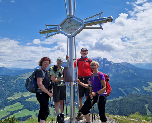 Mit dem Bus, der gerade frisch aus der Werkstatt kam, fuhren wir Richtung Berge und starteten gegen 9.00 Uhr bei bewölktem Himmel unsere Tour. Erst vorm Gipfel des Schobers zeigte sich die Sonne und wir genossen eine fantastische Sicht. Einige von uns besuchten noch das etwas tiefer gelegene Kreuz. Im Abstieg besuchten wir noch das Berliner Kreuz. Weiter abwärts wanderten wir über bunt blühende Almwiesen zur Gseng-Alm. Während wir einkehrten zog ein Regenschauer über uns hinweg. Im weiteren Abstieg wurden wir nochmal kurz nass, aber am Auto angekommen, waren wir wieder trocken. Eine schöne und durchaus anspruchsvolle Wanderung bleibt uns in Erinnerung.
