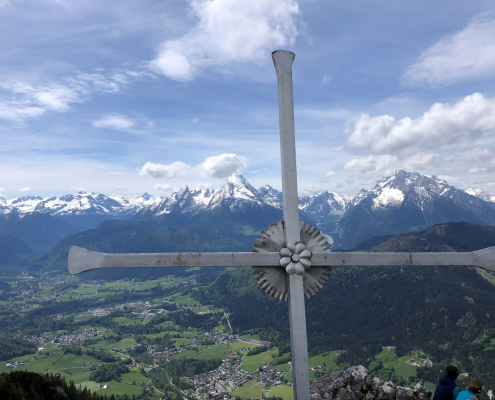 Hier genossen wir bei unerwartet perfektem Wetter den Ausblick auf die Berchtesgadner Bergschau. Vor allem die beeindruckende Südwand des Hochthrons ist hier zum Greifen nah.
