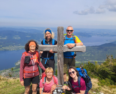 Unter strahlend blauem Himmel genossen wir am Gipfel der Brennerin unsere mitgebrachte Brotzeit, bestaunten die großartige Rundumsicht, erkundeten die umliegenden Berge und bewunderten die malerisch gelegenen Seen des Salzkammerguts.