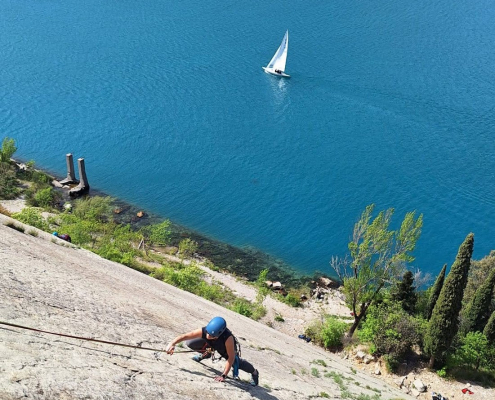 Wir vier, am Fels noch recht unerfahrenen Teilnehmer, durften uns mit unserem “Guide” Vincenc Zielonka zuerst am Reibungsklettern, inklusive Abseilen, versuchen. Direkt am Ufer des Gardasees an der “Corno di Bo” - What a view!! Ein großartiges Erlebnis, das wir mit einem kurzen Sprung in den noch eiskalten See und einem Aperol Sprizz in Torbole komplettierten.