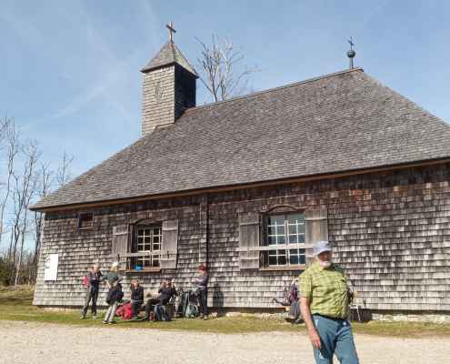 Auf schmalen Waldpfaden führt uns der Weg zur Kolomannssenke. Unterwegs konnten wir einen Harvester bei seinem Werk bewundern, Ab hier war der Weg schon herausfordernd steil, lehmig-schmierig und es waren umgefallene Bäume bis zu einem Meter Durchmesser zu übersteigen! Aber nach ca.150 Hm erreichten wir das Kolomannskircherl, welches die älteste, nur aus Holz gebaute Kirche Österreichs ist. Hier hat man einen herrlichen Panoramablick, welcher vom Traunstein über Dachstein, Göll, Watzmann und Kalter bis zur Reiter Alpe geht. Die Dominante ist jedoch die unweit gelegene Pyramide des Schafbergs.