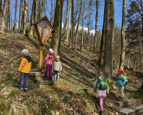 Die Familiengruppe war Mitte März wieder im Wald oberhalb von Julbach unterwegs: 11 Teilnehmer, davon 5 Kinder im Alter von 3-6 Jahren. Der Tag war sonnig und ziemlich warml Vielleicht schafften deshalb diesmal auch unsere Kleinsten die ganze Tour (ca. 3,5 km). Ab und zu konnten sich die Kinder selber den Weg aussuchen, was unendlich Spaß machte. Unser Naturforscher Raimonds hat im kleinem Teich sogar Wassermolche entdeckt! Zapfen-schießen konnte nicht fehlen; wir haben auch den Spiel Fichtenzapfenkacken ausprobiert, was aber eher die Erwachsene begeistert hat :-). An der Burgruine haben wir eine wohlverdiente Pause mit bester Aussicht gemacht. Danke allen Teilnehmern! Wir freuen uns auf nächste Tour mit Euch.